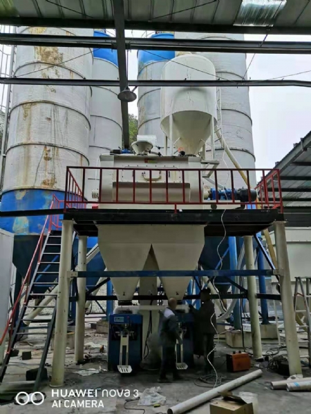 該型號(hào)設(shè)備由原料倉(cāng)、輸送螺旋、配料秤、斗式提升機(jī)、雙軸無重力混合機(jī)、主機(jī)平臺(tái)、成品倉(cāng)、自動(dòng)包裝機(jī)、除塵器等組成。主要用于生產(chǎn)石膏砂漿、抹灰石膏砂漿等產(chǎn)品。